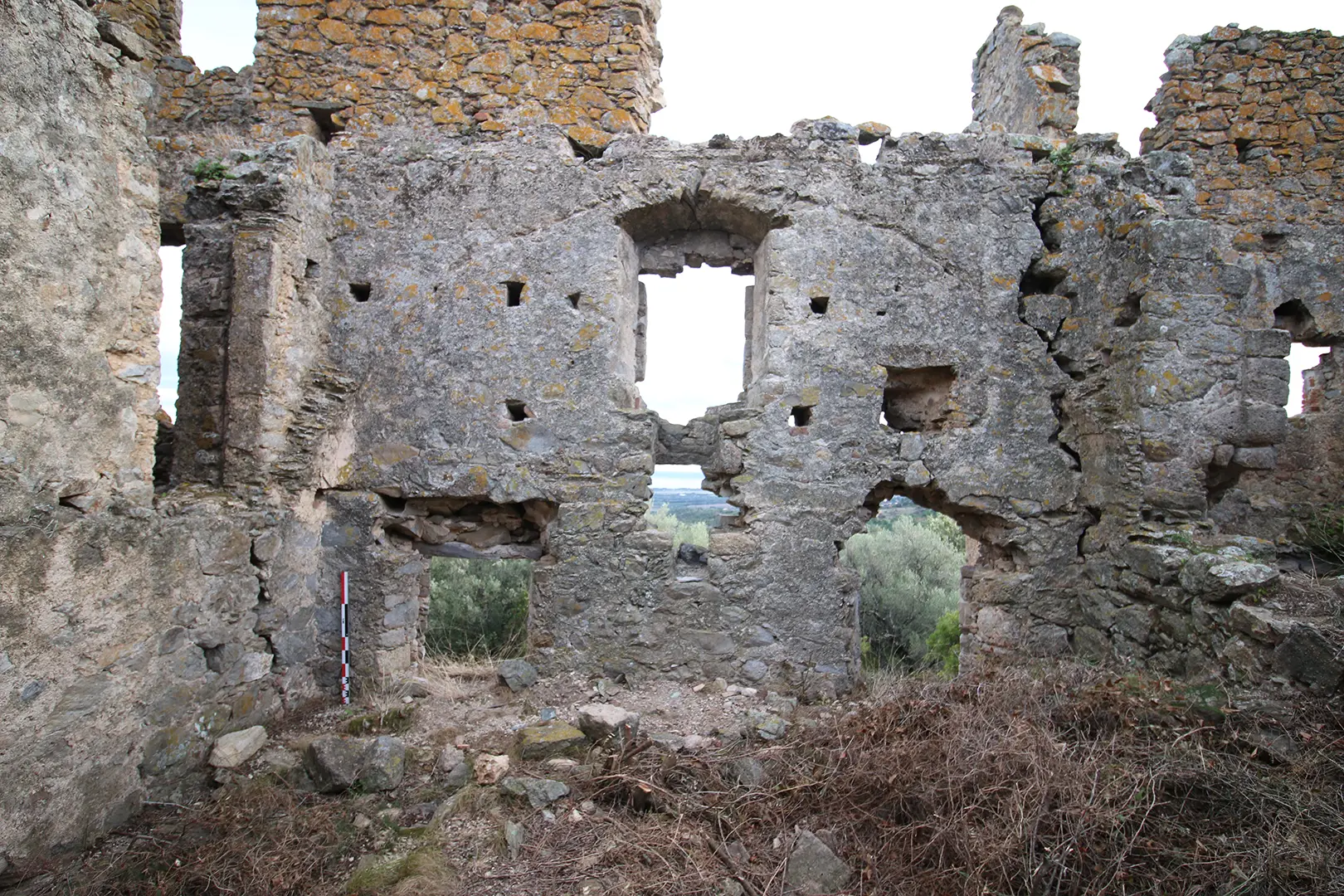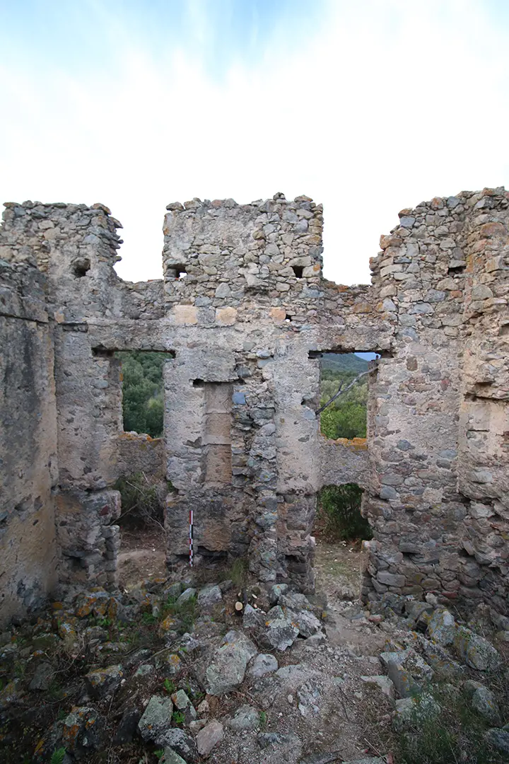 En dehors de la Chronique, le rapport de Castruccio Castracani (Meloni, 1995), seigneur de Lucques, à l’infant d’Aragon considère en 1325 les Covasinacci parmi les seigneurs les plus influents de l’île. Toutefois, au cours des révoltes populaires des années 1357 et 1358, les châteaux des Covasinacci ne semblent pas échapper aux destructions. Dans le Deçà des Monts, les seigneurs sont dépossédés de leurs biens et leur statut social évolue : gentilshommes, caporaux ou encore simples habitants. Mais que sont devenus les Covasinacci de Covasina ? Le monument qui se dresse aujourd’hui fièrement sur la colline n’appartient pas à ce passé médiéval, il résulte de l’évolution d’au moins deux noyaux d’habitations, établis au cours du XVIe siècle, formant un corps central délimité par deux ailes latérales. L’étude du bâti a toutefois permis d’identifier un tronçon de mur qui ceint la partie nord-est de la plateforme sommitale. Son appareillage formé de blocs, de calibre moyen, disposés avec soin et liés au moyen d’un mortier de chaux, renvoie aux faciès constructifs du Moyen Âge. C’est donc à l’aplomb de cette élévation qu’un premier sondage a été implanté. Le second, dans le même secteur, a surtout consisté en un nettoyage de surface permettant de dégager les constructions ensevelies sous un épais roncier. Enfin, un troisième sondage a été implanté à l’angle sud-ouest du Palazzu.