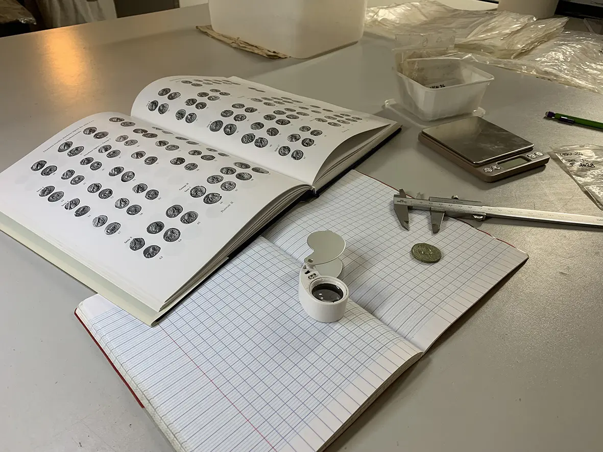 La numismatique consiste à étudier les monnaies et les ensembles monétaires (dépôts, trésors, etc.) issus de fouilles archéologiques. Artefacts régulièrement mis au jour sur des chantiers de fouille de la Protohistoire à la période contemporaine, les monnaies constituent des marqueurs chronologiques fiables.