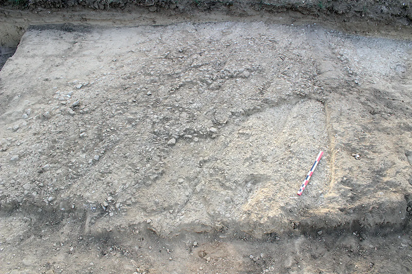 Ce décalage vers le nord de l’axe viaire semble entériné dans un second temps, avec l’installation d’une nouvelle voie. Bien que sa bande de roulement soit très lacunaire, son tracé se suit grâce aux deux fossés bordiers orientés grossièrement est-ouest. L’absence de mobilier associé ne permet pas néanmoins de dater précisément cet aménagement.