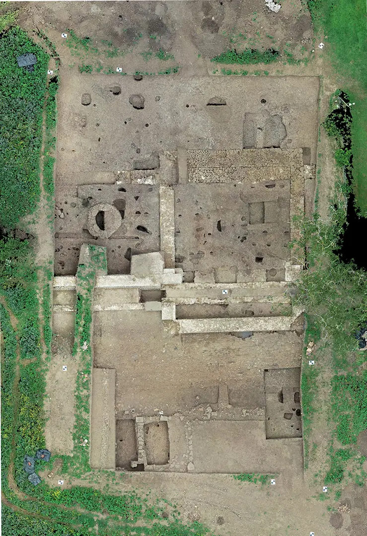 La zone au sud de la voie n’a quant à elle livré aucun aménagement témoignant de la nature de l’occupation dans cette partie de l’agglomération. Une cellule quadrangulaire ponctuée aux angles par de gros dés d’impactite semble en effet postérieure, étant installée dans une couche de démolition à base de TCA. Sa fonction n’a pas pu être précisée lors de la fouille en l’absence de niveau de sol conservé.