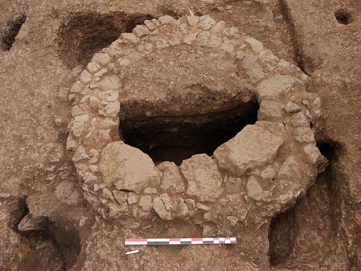 Le décapage extensif a permis de mettre au jour de très nombreuses structures fossoyées aménagées dans le substrat rocheux (impactite) : trous de poteau, tranchées, fosses… Bien que la zone ouverte soit plus large, il est difficile de pouvoir distinguer une organisation particulière trahissant la présence d’un bâtiment. L’examen détaillé des stratigraphies a tout du moins révélé deux états successifs pour cette première occupation du secteur, le dépôt de terres sombres associé s’articulant en deux couches et plusieurs structures fossoyées se recoupant. Le dernier état est d’ailleurs marqué par la mise en place d’un puits dont la margelle était particulièrement bien conservée. La fouille de ces premiers niveaux a livré un très abondant mobilier céramique avec 8 caisses de céramiques (137 lots) et 10 caisses d’amphores (113 lots).