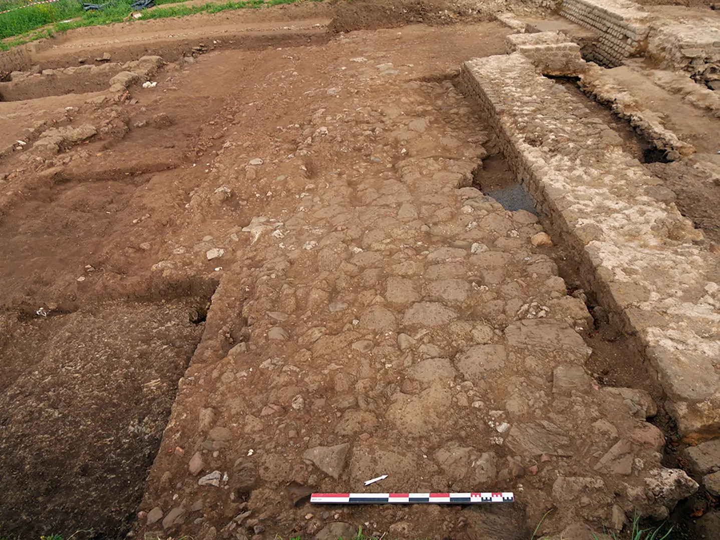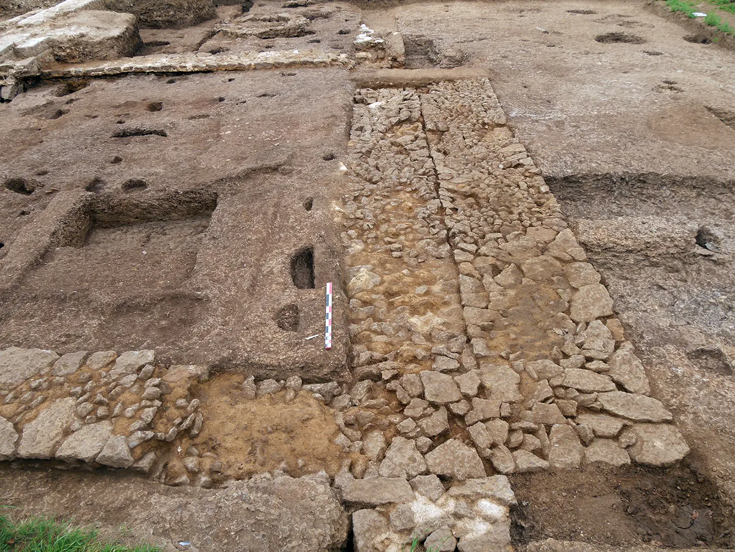 Plus ou moins concomitamment, une voie composée de dalles d’impactite à la surface arrondie et marquée par plusieurs ornières orientées est-ouest est aménagée dans la partie sud de l’emprise de fouille. N’excédant pas 5 m de large, elle semble épouser l’orientation générale des structures fossoyées. Sa bande de roulement au nord est par ailleurs coupée par l’installation du sanctuaire, nécessitant par la suite un rechapage ponctuel composé d’un remblai de petits cailloutis remontant contre le parement sud des maçonneries du lieu de culte.
