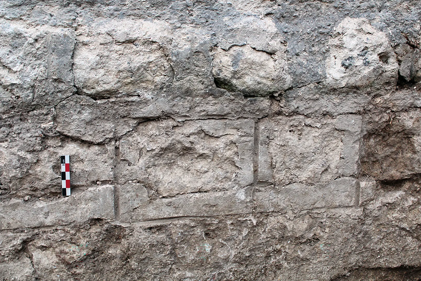 L’étude du bâti n’est pas en reste quant à l’identification de travaux à attribuer à cette époque. Si à l’ouest, le mur séparant les deux maenania présentait des joints gris qui pouvait rappeler les réfections du père jésuite, les vestiges étaient beaucoup plus clairs à l’est. Plusieurs pans de maçonnerie conservaient en effet des joints tirés au fer qui peuvent être datés du début du XXe siècle au vu de leur composition. Les écrits du Père de la Croix mentionnent ainsi le souci des artisans de l’époque d’employer des techniques proches de celles antiques, notamment l’emploi d’un fer pour marquer les joints entre les moellons. Le reste des parements présente des reprises beaucoup plus classiques, en aplats, la seule différence consistant dans la composition du liant utilisé.