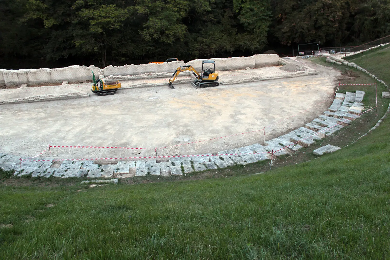 Après une première phase de travaux sur le théâtre en 2021 portant sur la restauration des murs de scène et d’arrière-scène, la présente opération concernait le parascaenium et le vomitoire à l’est, le parodos et le vomitoire à l’ouest, l’orchestra et le maenanium. Ces travaux se sont articulés en deux tranches entre 2022 et 2023, chacune portant sur une aile du théâtre, d’abord l’occidentale puis celle orientale. Cela permettait ainsi de conserver un accès pour les visiteurs à l’édifice classé au titre des Monuments Historiques.